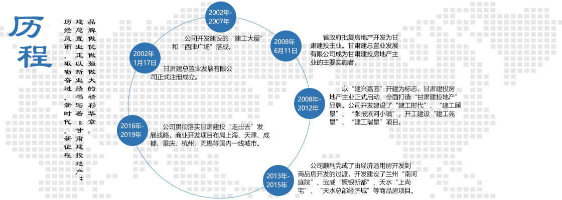 甘肅建總置業(yè)發(fā)展有限公司成立于2002年,隸屬于中國企業(yè)500強甘肅省建設(shè)投資(控股)集團有限公司(簡稱“甘肅建投”),注冊資本金五億元,房地產(chǎn)開發(fā)一級資質(zhì),建筑工程施工總承包三級資質(zhì),為國有獨資企業(yè),是一家集房地產(chǎn)開發(fā)、物業(yè)管理和資產(chǎn)運營管理為一體的綜合性企業(yè)。