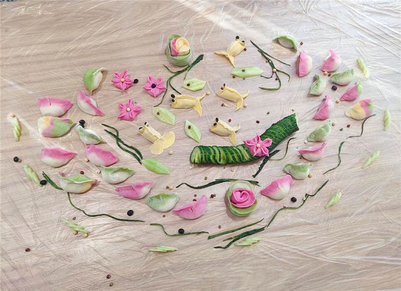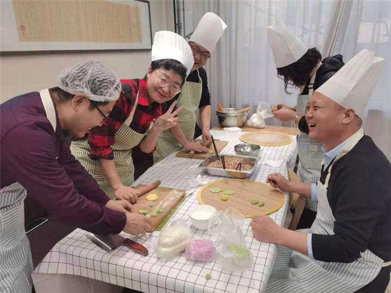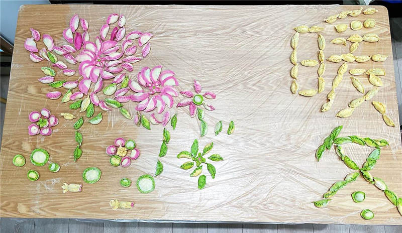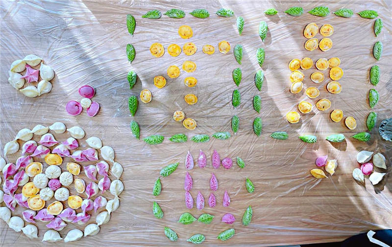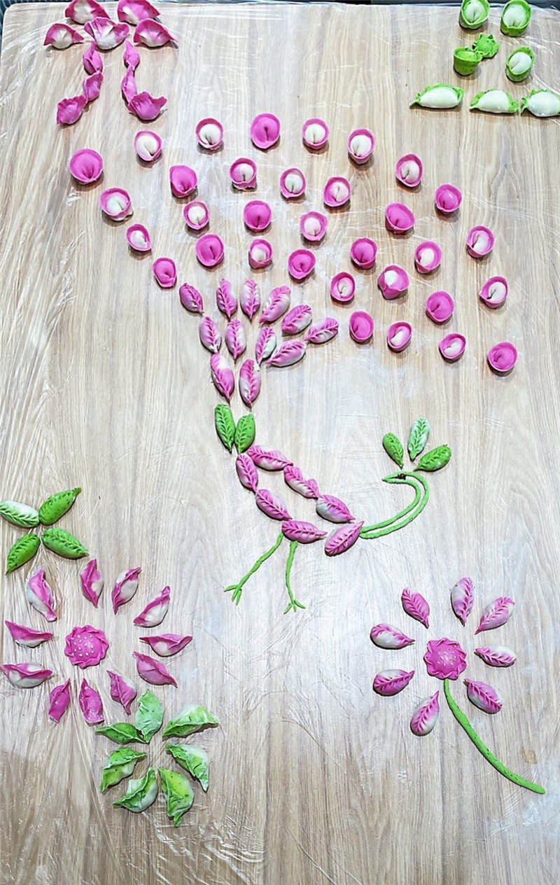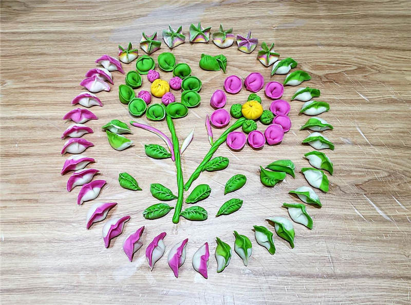 在活動(dòng)中,大家分工協(xié)作,井然有序,有人和面、有人拌餡、有人搟皮、有人包褶。再看看大家包的餃子,形態(tài)不一、極具創(chuàng)意,餃子皮的更是用色大膽,紅的、黃的、綠的。