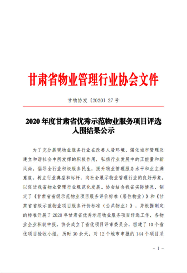 近日,天水上尚宅項目獲2020年度“甘肅省物業(yè)管理優(yōu)秀示范項目”,總部經(jīng)濟城獲2020年度“甘肅省物業(yè)管理優(yōu)秀示范大廈”。本次評選活動由12個地市申報的144個項目參與,評審委員會采取聽、看、談、訪、查等多種方式,對標對表對參選項目進行評選,歷時30余天,最終確定評選結(jié)果。