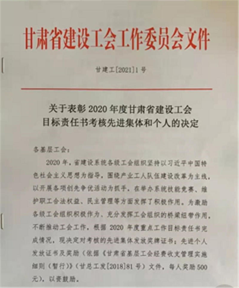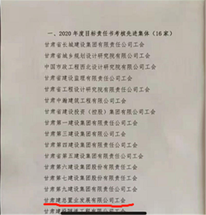 近日,置業(yè)公司工會(huì)在甘肅省建設(shè)工會(huì)委員組織的2020年度甘肅省建設(shè)工會(huì)目標(biāo)責(zé)任書(shū)考核中評(píng)為“2020年度目標(biāo)責(zé)任書(shū)考核先進(jìn)集體”。