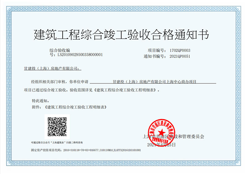 4月25日,甘建投商務(wù)廣場項(xiàng)目順利取得《建設(shè)工程竣驗(yàn)收備案證明》。本次備案是在上海市青浦區(qū)建設(shè)和管理委員會的嚴(yán)格督導(dǎo)下,按照備案程序,依法依規(guī)辦理。