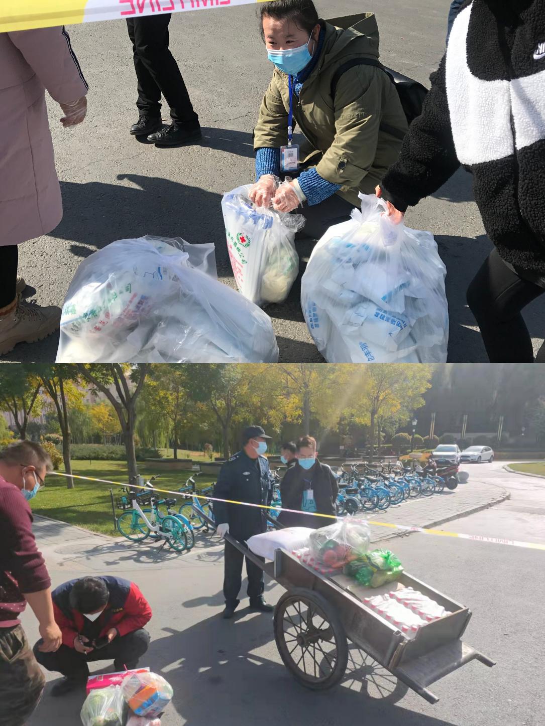 10月21日早,分公司員工在保護(hù)好自我的同時(shí),堅(jiān)持各個(gè)環(huán)節(jié)嚴(yán)守到位,先后采購(gòu)防疫物資,往小區(qū)運(yùn)送55套防護(hù)服、防護(hù)面具、口罩和部分消殺物料和食物,通過(guò)各自關(guān)系借調(diào)超市購(gòu)物車四輛。