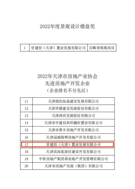 近日,由甘肅建總置業(yè)發(fā)展有限公司天津置業(yè)子公司開(kāi)發(fā)建設(shè)的百酈榮錦苑項(xiàng)目榮獲天津市房地產(chǎn)業(yè)協(xié)會(huì)2022年度景觀設(shè)計(jì)樓盤(pán)獎(jiǎng)及先進(jìn)房地產(chǎn)開(kāi)發(fā)企業(yè)。