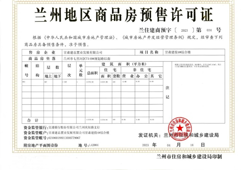 4月19日,甘肅建投4#綜合樓項(xiàng)目不負(fù)眾望順利取得《預(yù)售許可證》,標(biāo)志著4#樓項(xiàng)目正式準(zhǔn)入市場預(yù)售。