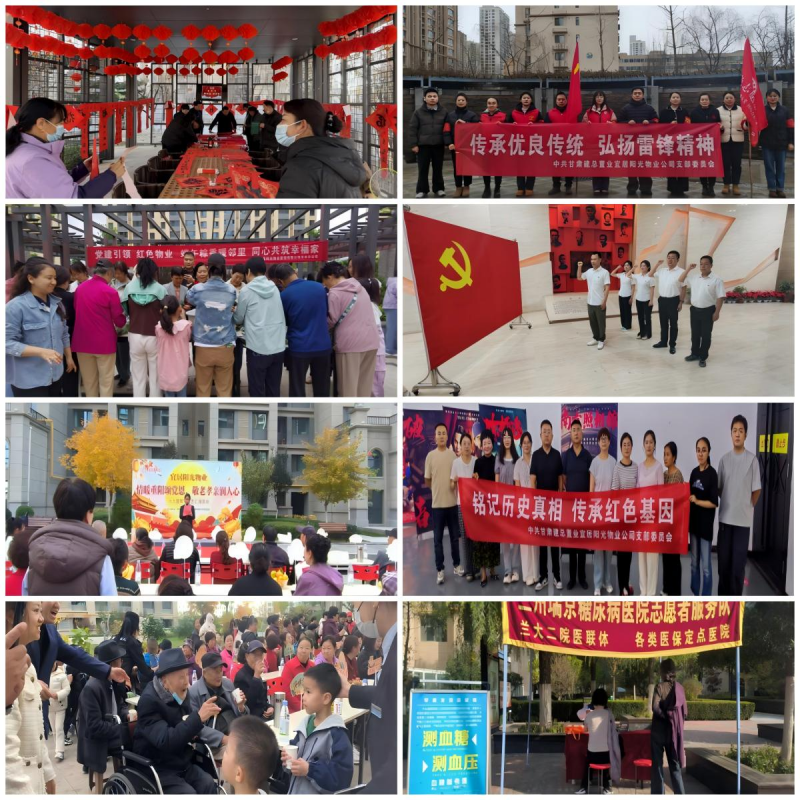 一是在蛇年春節(jié)前夕開展寫春聯(lián)送新春祝?;顒樱惺軅鹘y(tǒng)文化的獨特魅力。二是組織開展“學雷鋒 踐行動”主題黨日活動,把組織生活與業(yè)主環(huán)境整治工作有機結(jié)合,弘揚志愿精神,不僅幫助了生活困難的家庭,也美化了居住環(huán)境,進一步增強了黨員青年的服務意識、責任意識及表率意識,以實際行動踐行黨員的先進性。三是開展“慶六一、迎端午”小區(qū)文化活動,給孩子們提供一段快樂的時光,讓他們感受節(jié)日的快樂,同時也讓廣大業(yè)主品味傳統(tǒng)民俗文化,感受傳統(tǒng)節(jié)日的文化內(nèi)涵,增進物業(yè)與業(yè)主的交流。四是組織黨員走進八路軍蘭州辦事處紀念館以及觀看《南京照相館》,從百年黨史和革命先烈英勇事跡中汲取奮進的力量,接受深刻的愛國主義洗禮和黨性教育。五是九九重陽佳節(jié)舉辦文藝匯演暨公益服務實踐活動,大力弘揚中華民族尊老、敬老、愛老、助老傳統(tǒng)美德。六是科普義診“請進來”,以實際行動踐行初心使命,把優(yōu)質(zhì)、便捷的醫(yī)療服務送到居民身邊,為居民送溫暖、送健康。